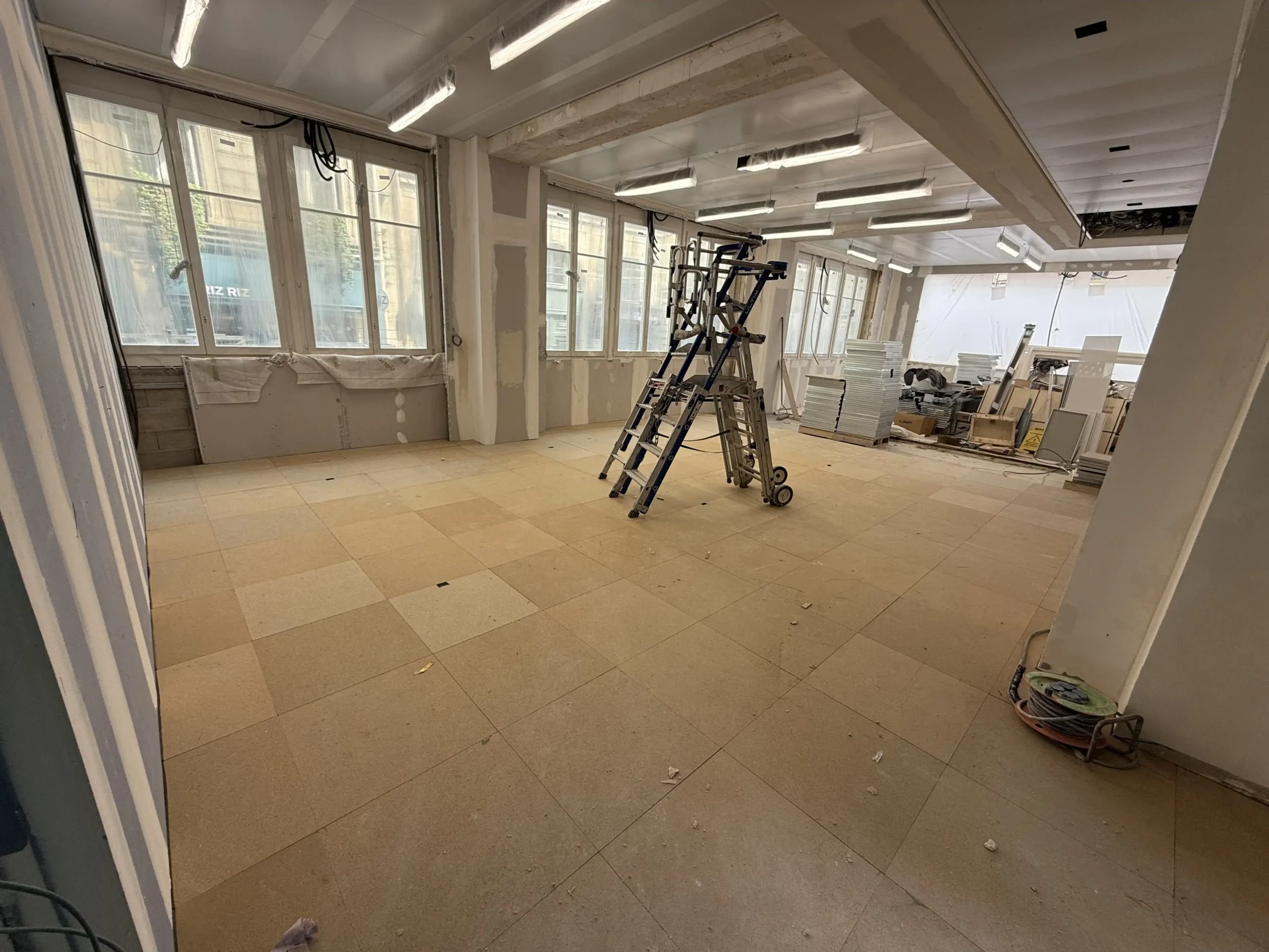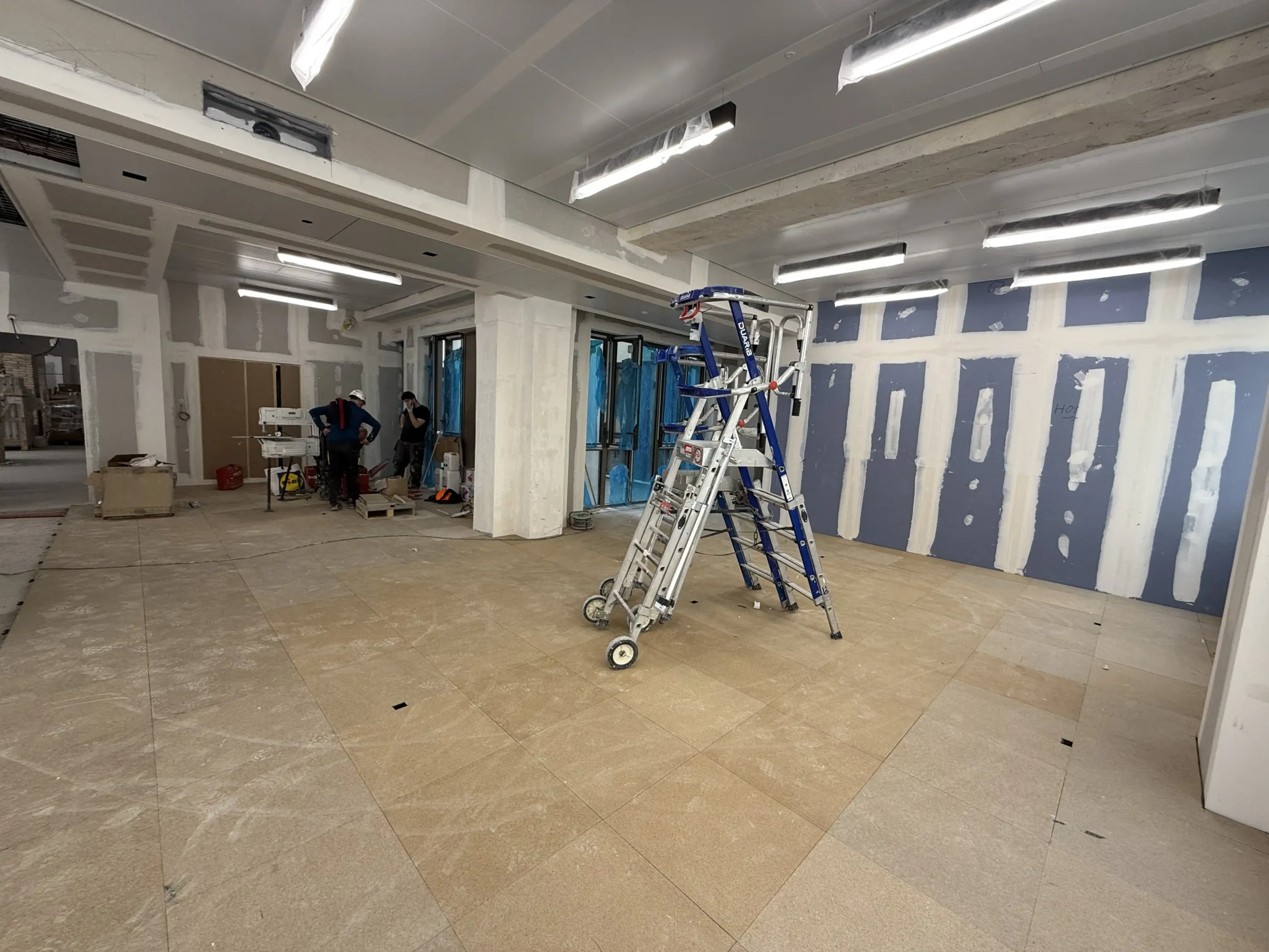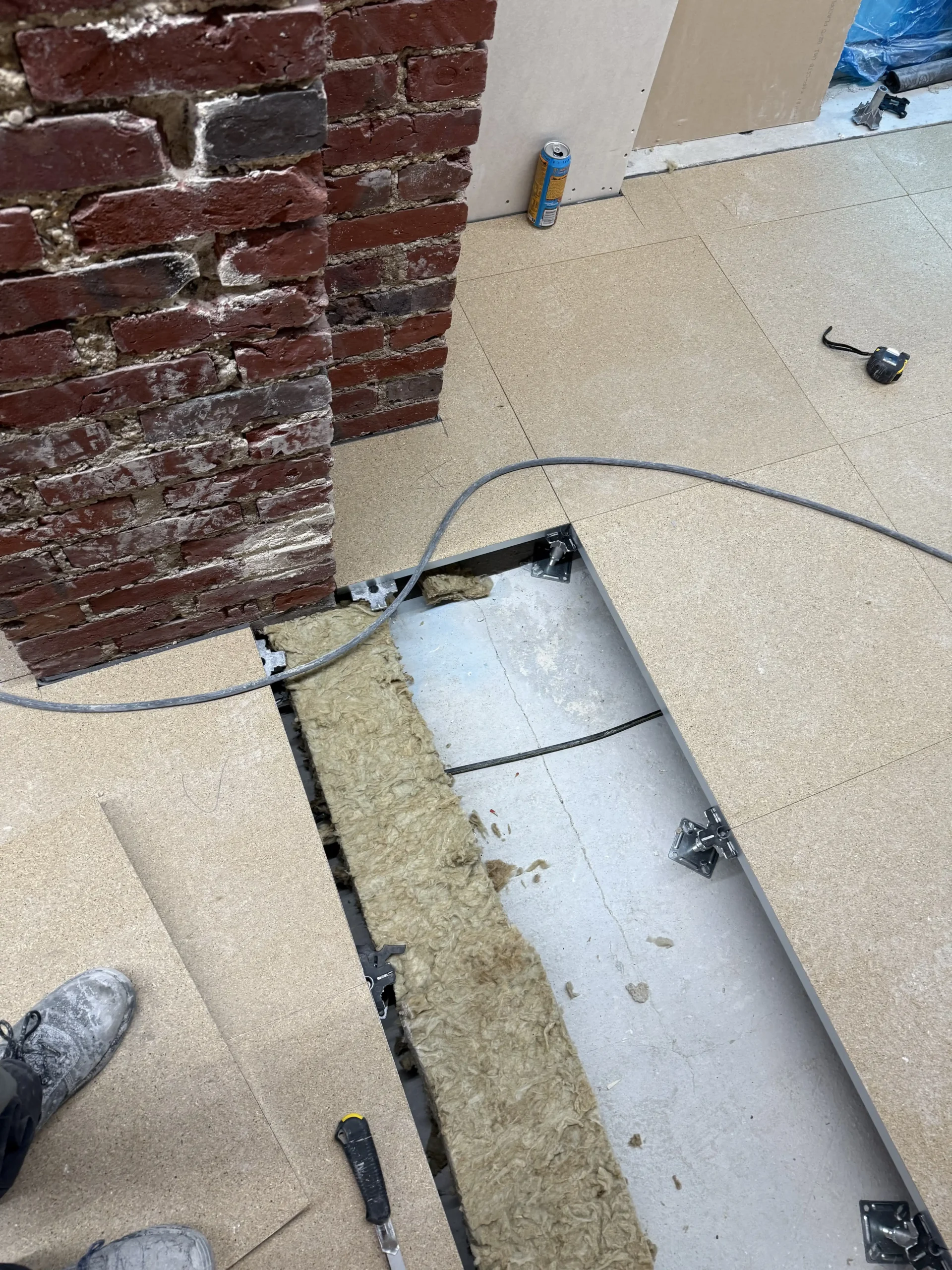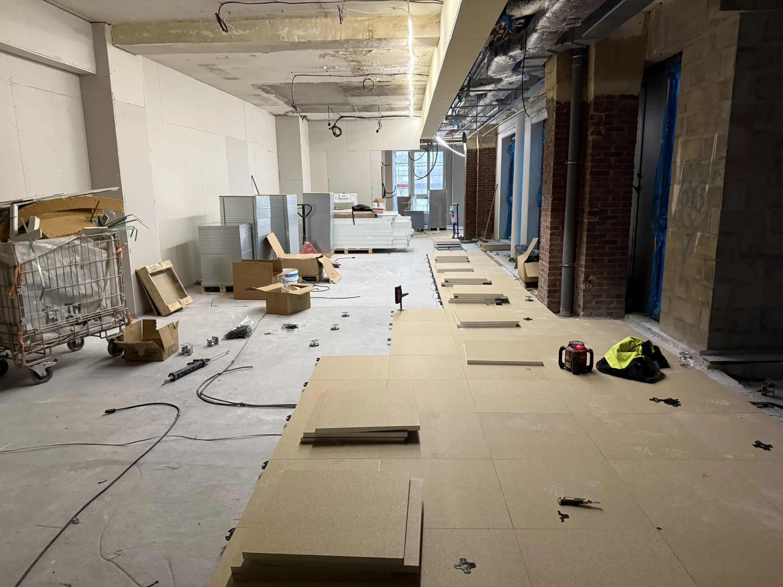Chantier de plancher technique neuf en dalles agglomérées Burobox, posé sur un plénum de 60 à 80mm.