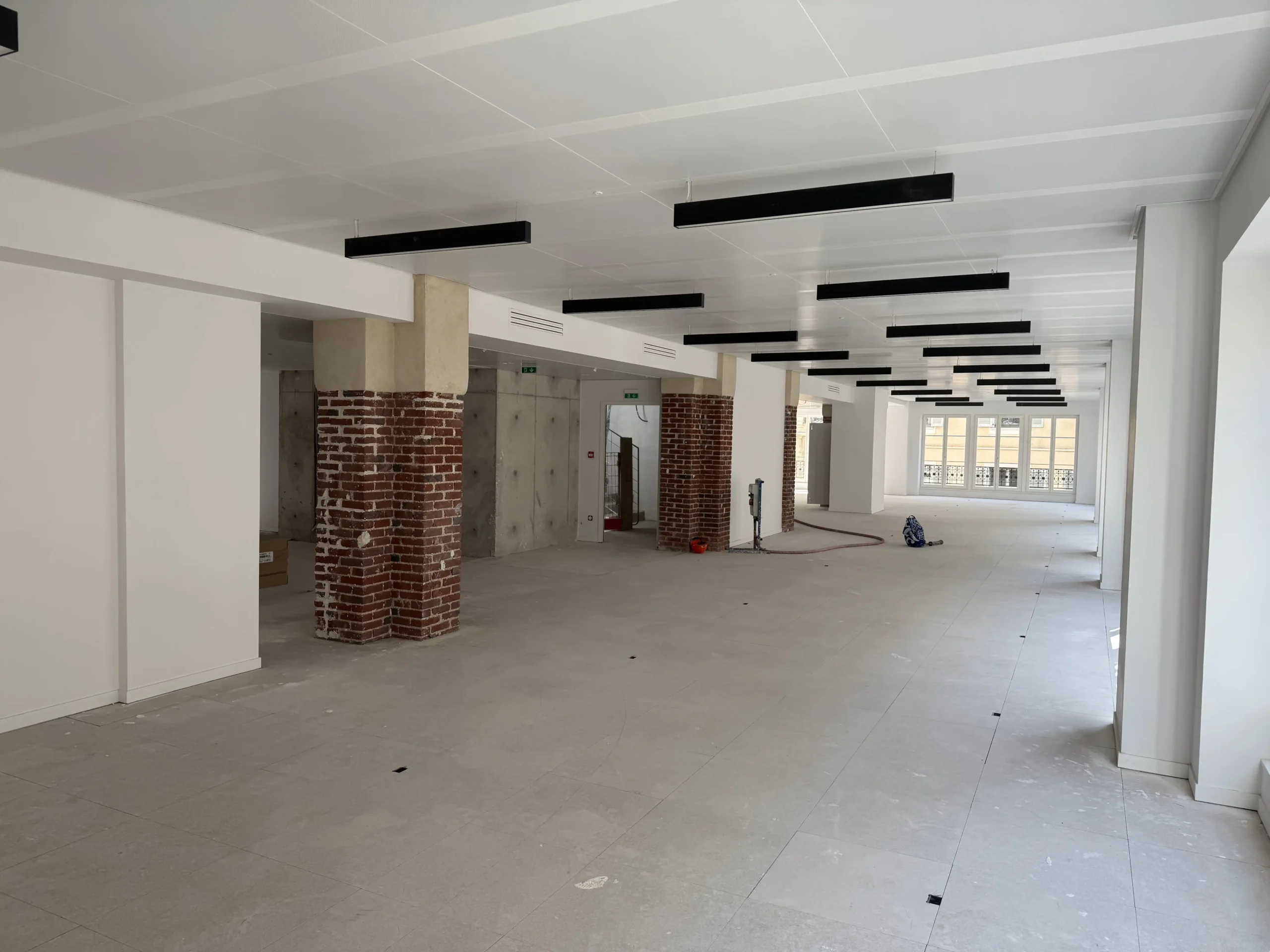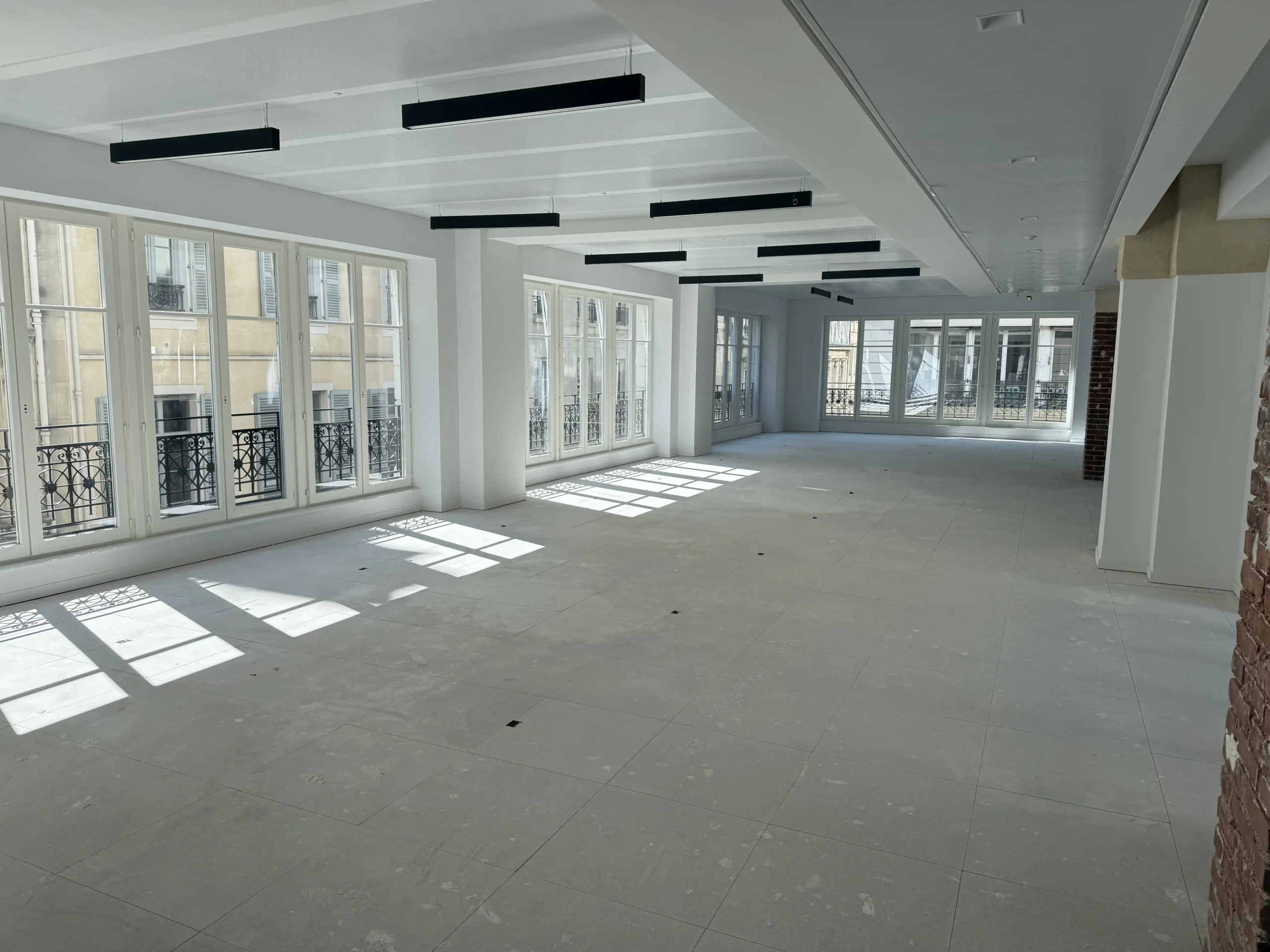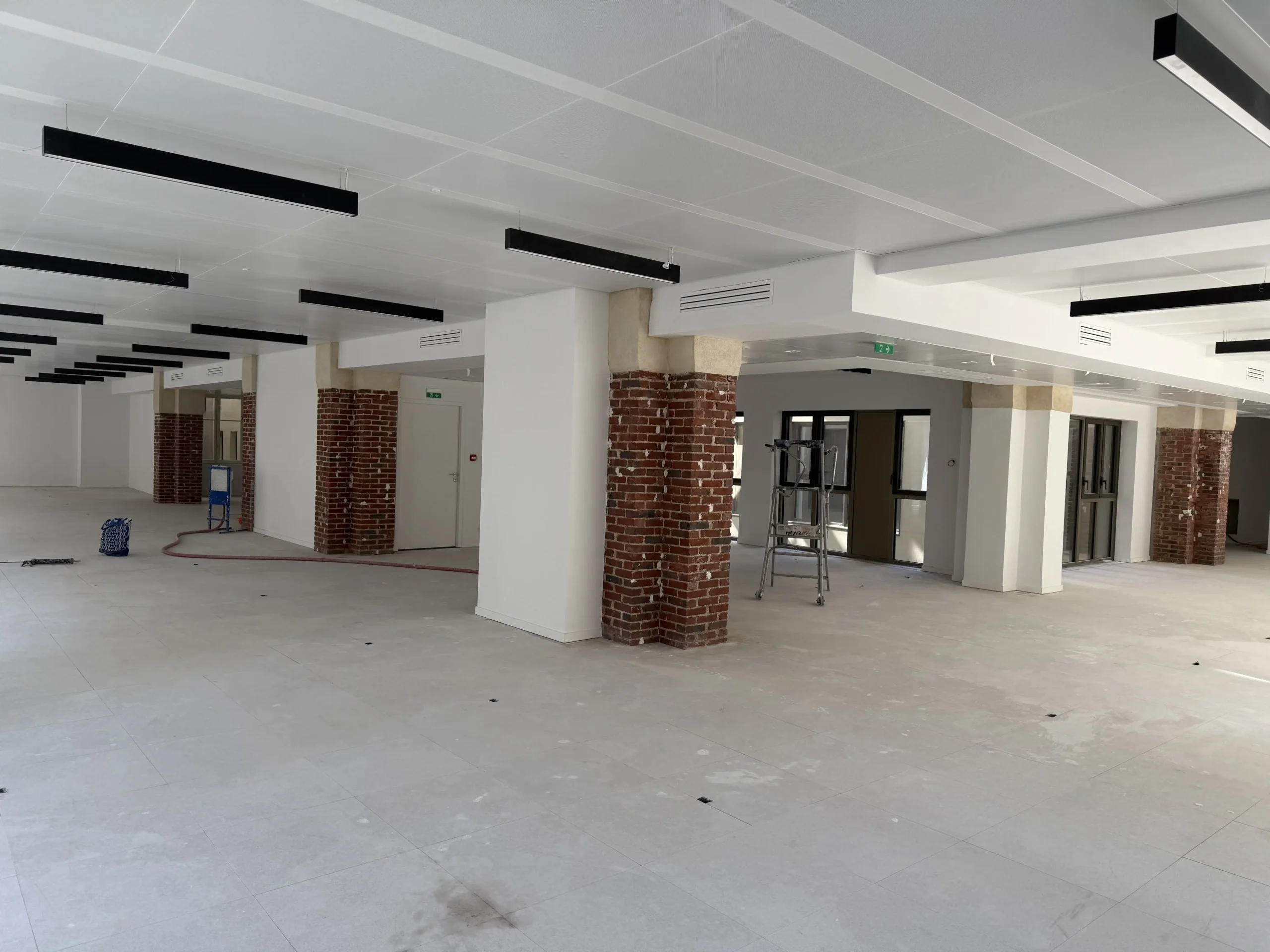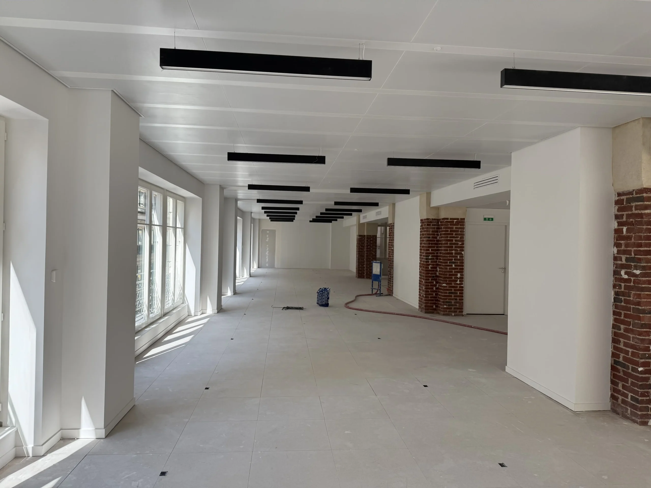 Chantier de plancher technique neuf en dalles agglomérées Burobox, posé sur un plénum de 60 à 80mm.