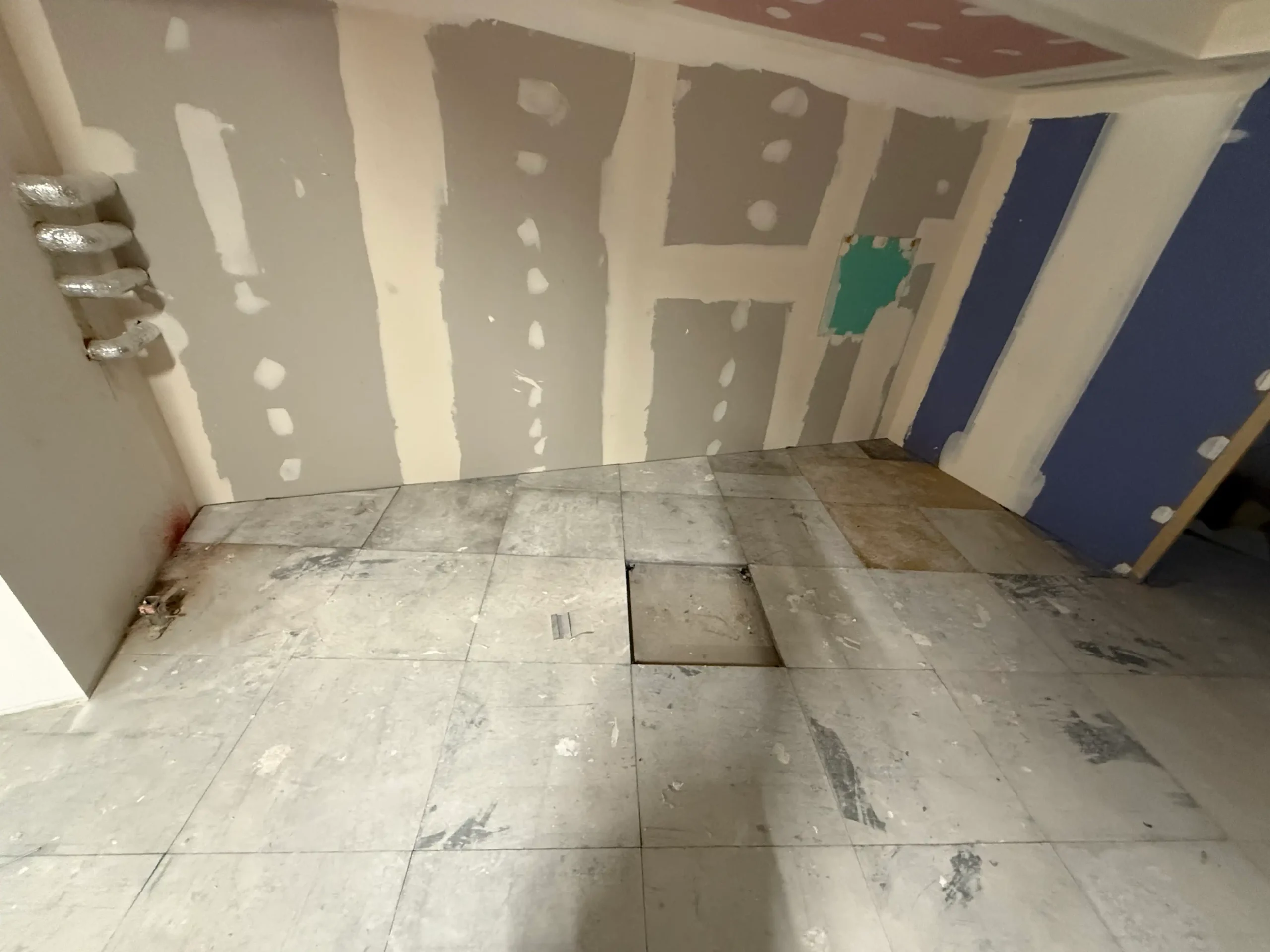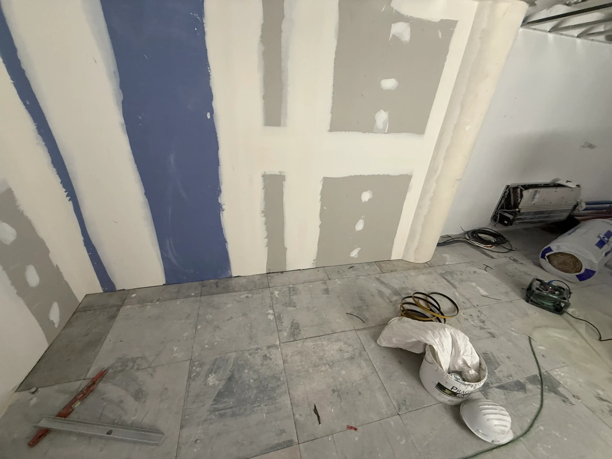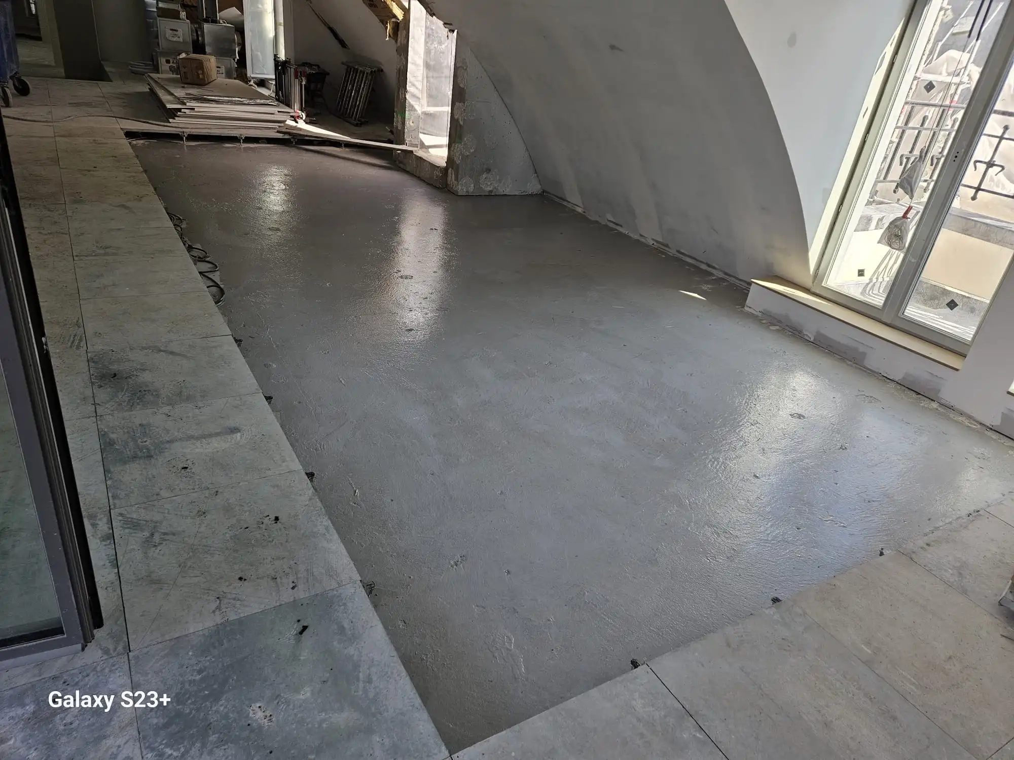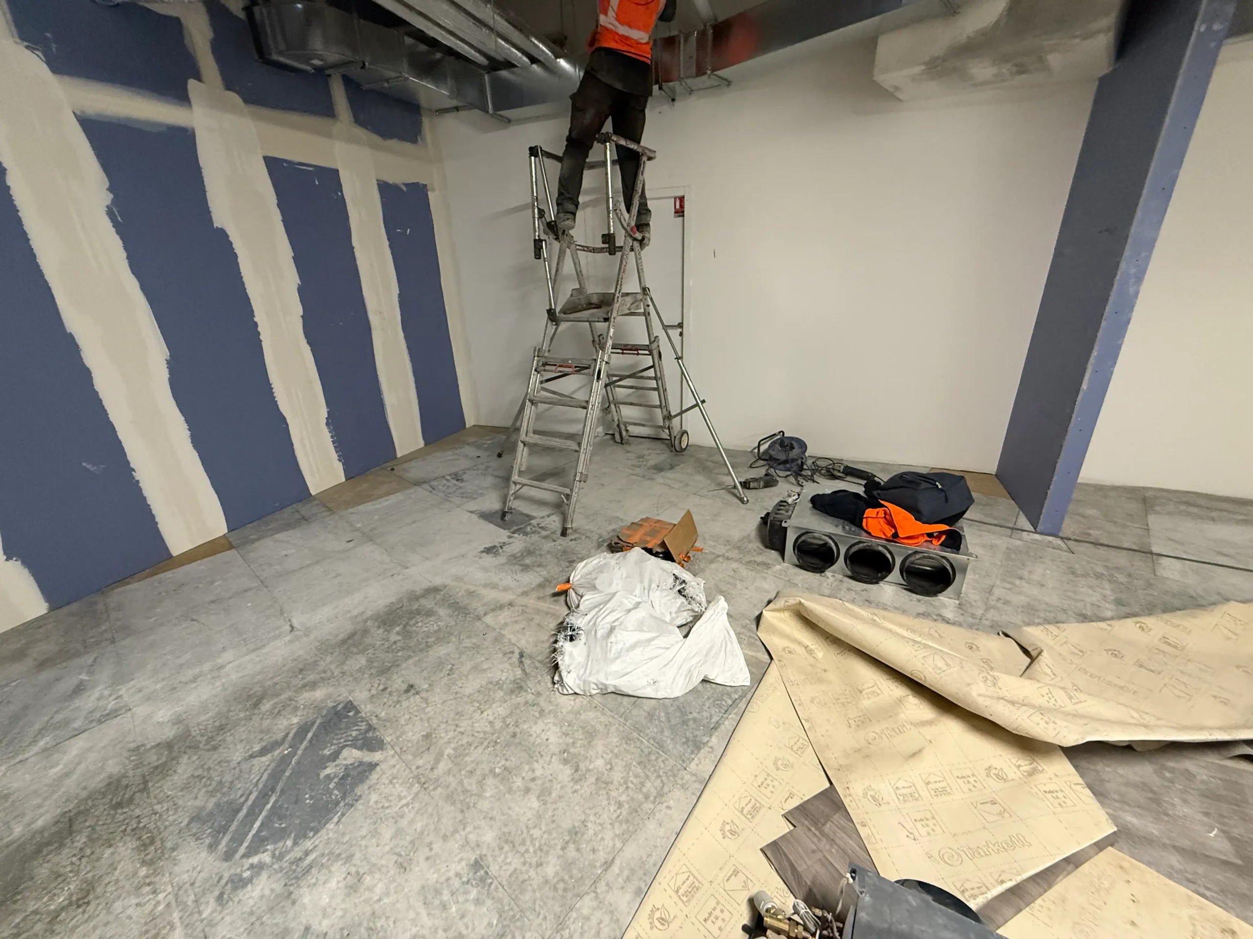 Chantier de pose d’un plancher technique de réemploi en dalles agglomérées sur un plénum de 50 à 100 mm avec application d’une peinture anti-poussière.