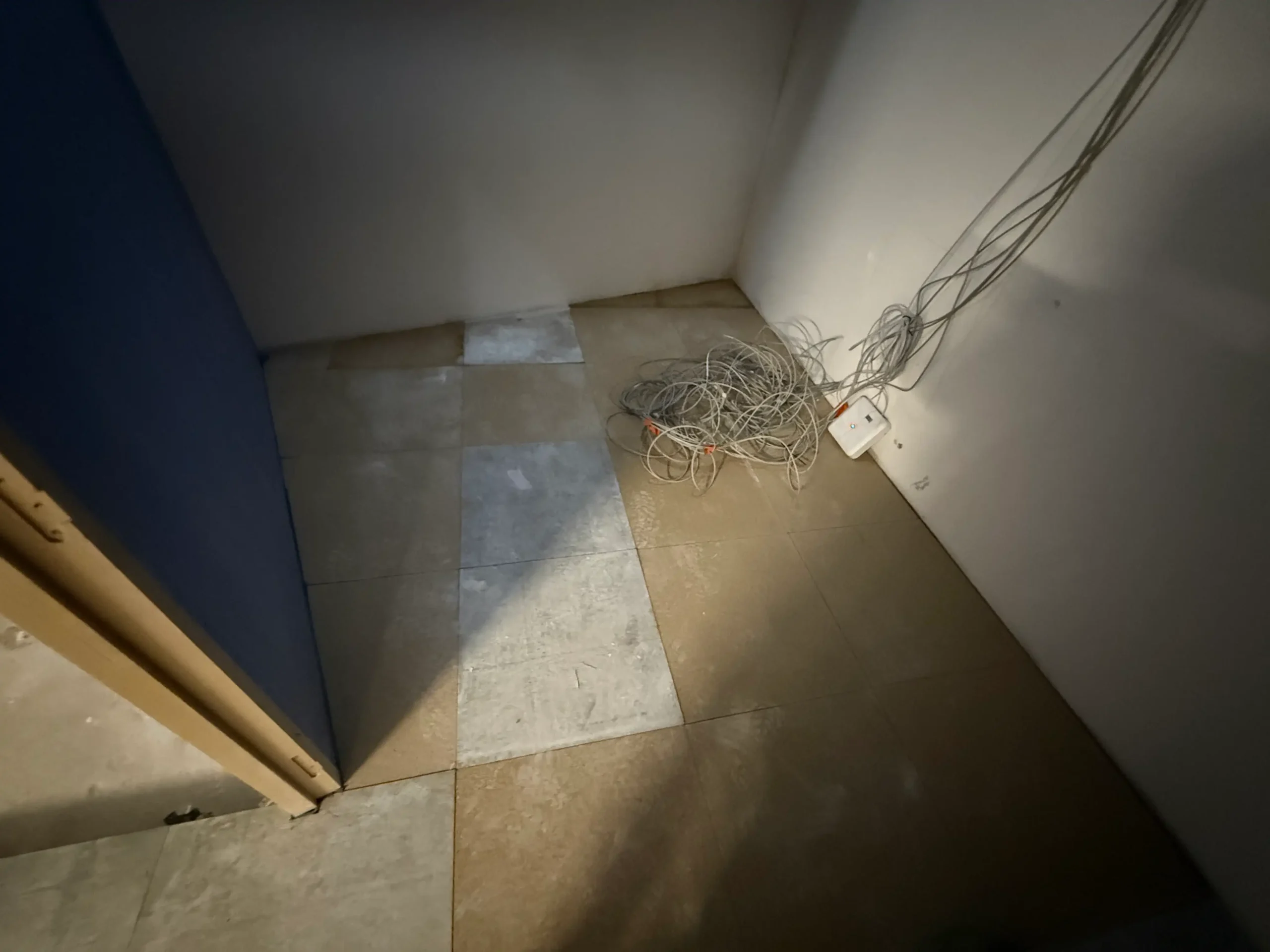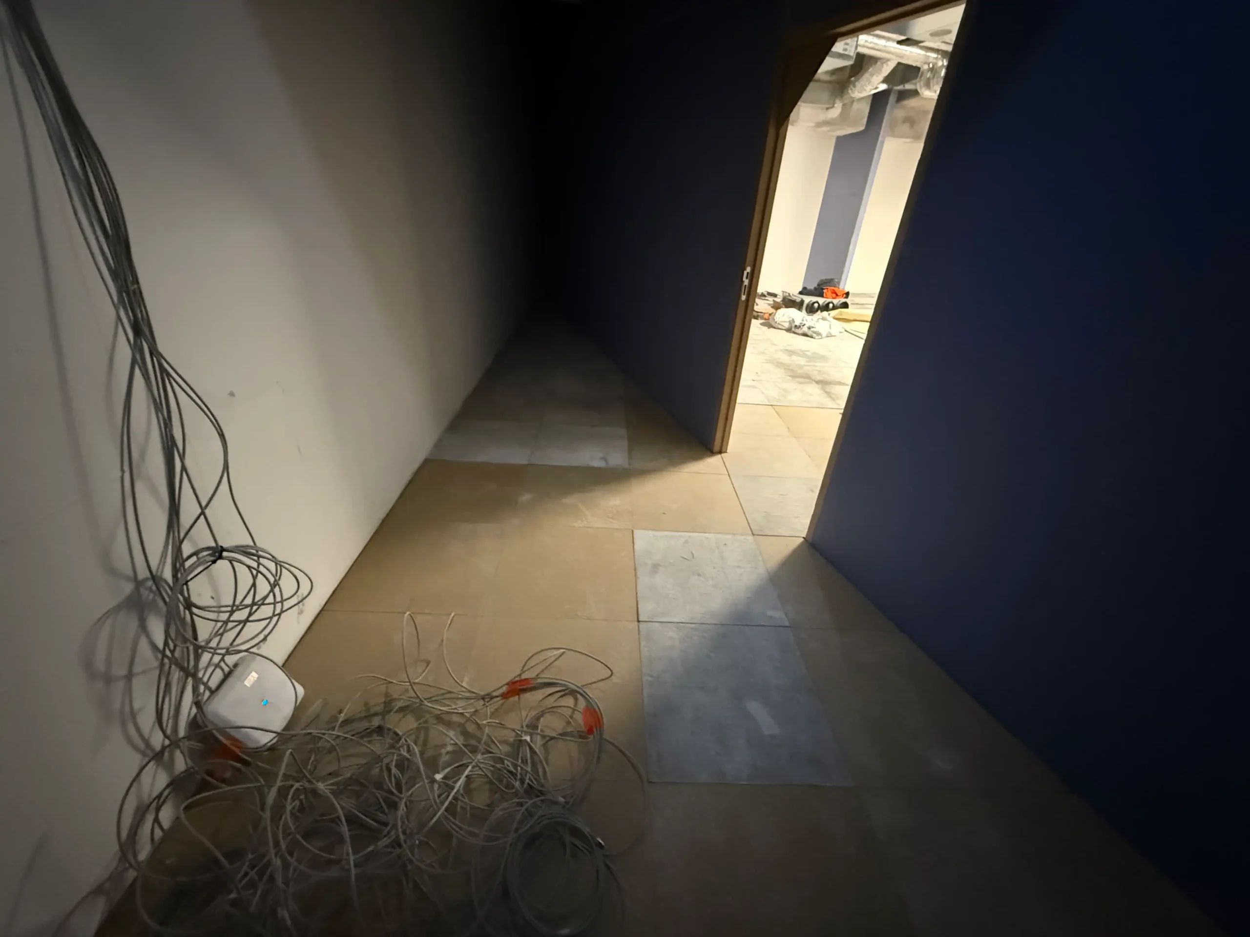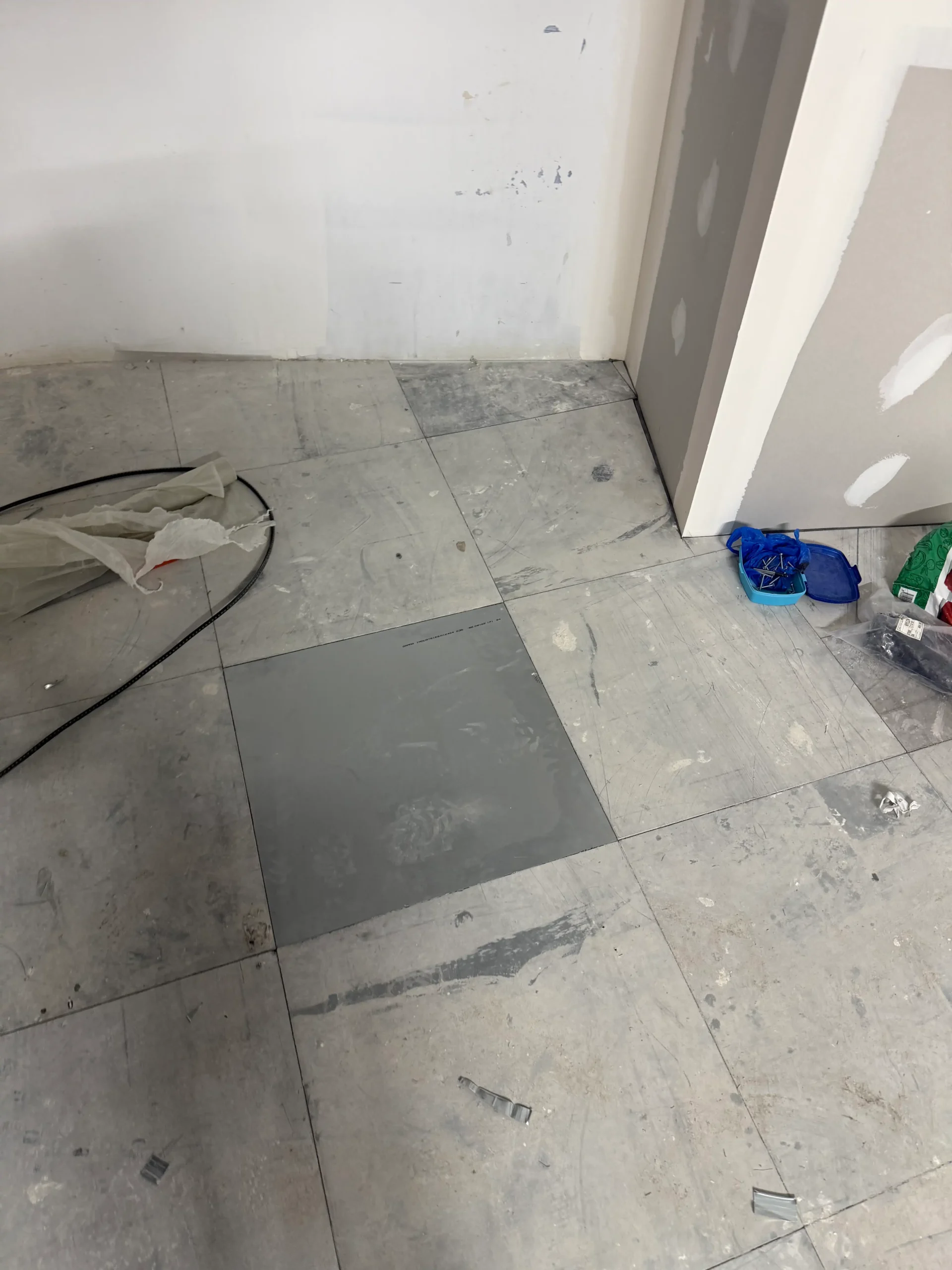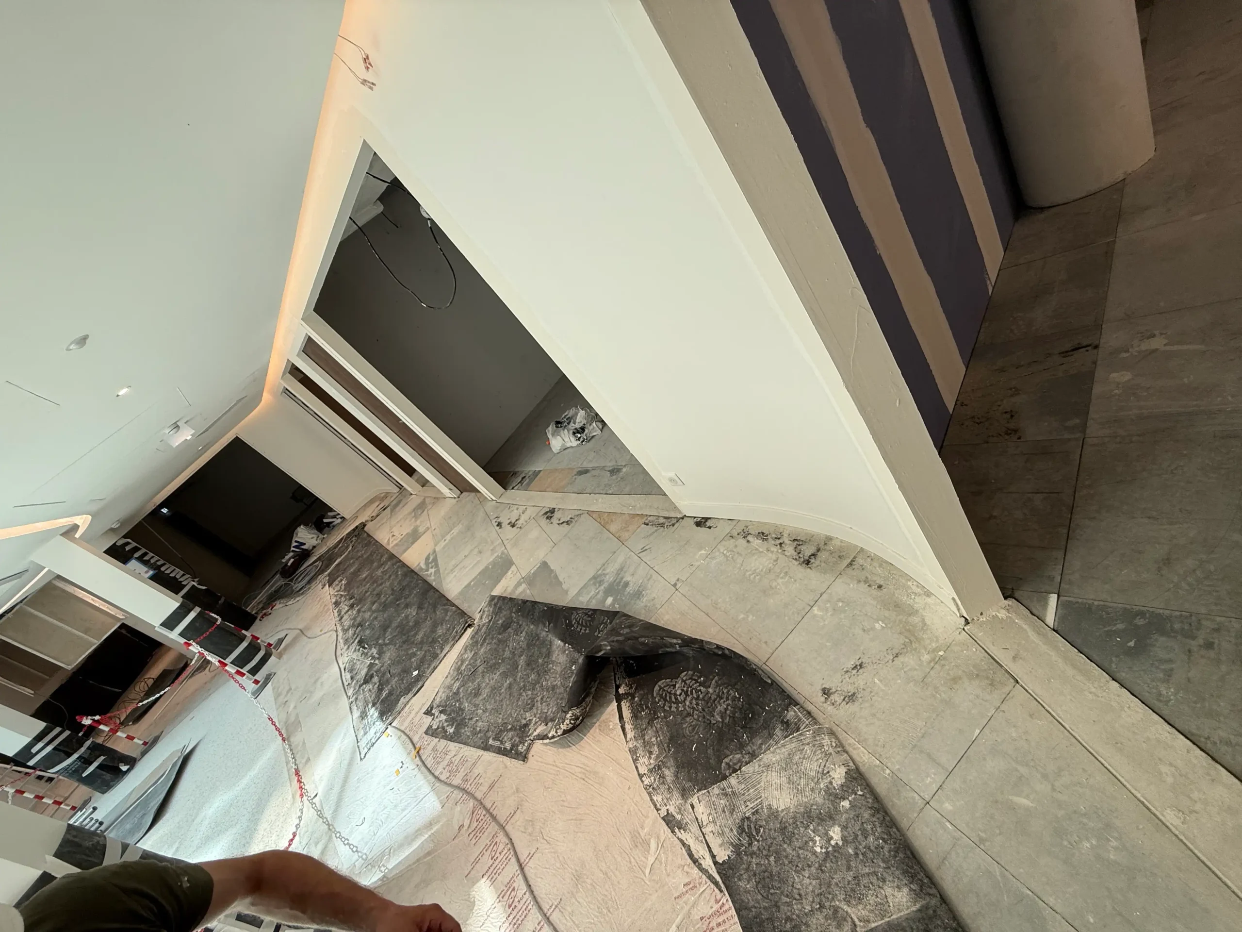 Chantier de pose d’un plancher technique de réemploi en dalles agglomérées sur un plénum de 50 à 100 mm avec application d’une peinture anti-poussière.