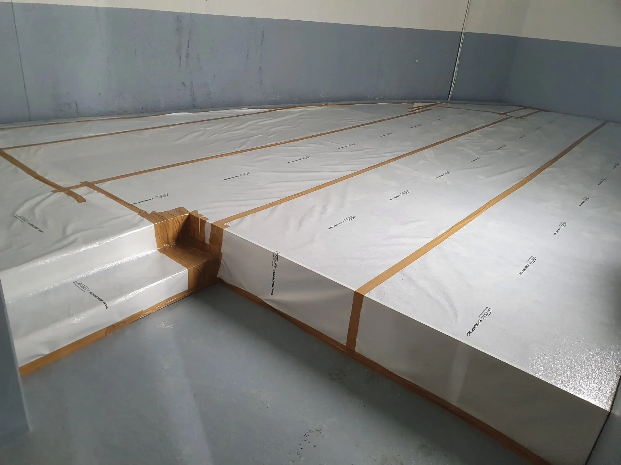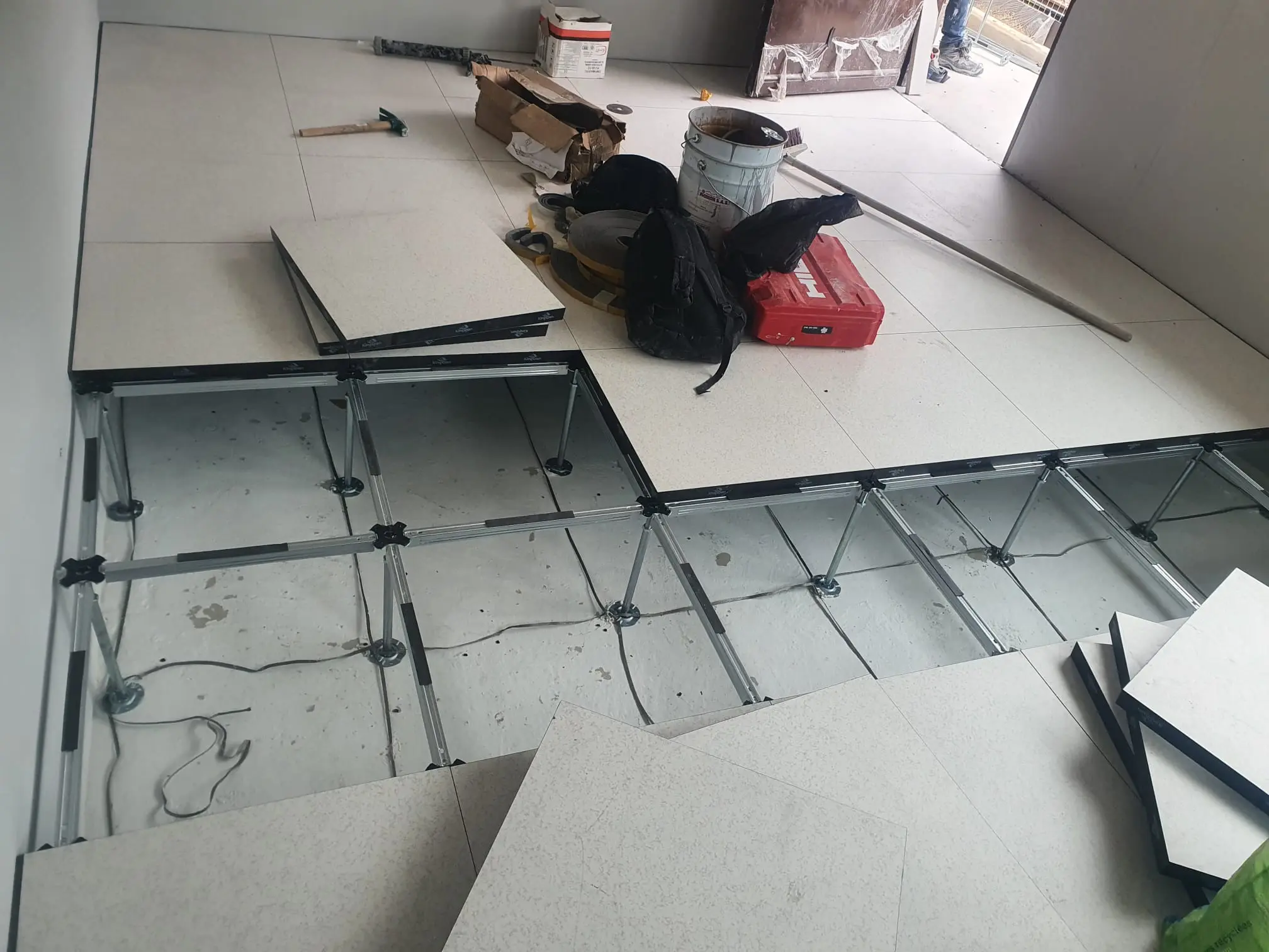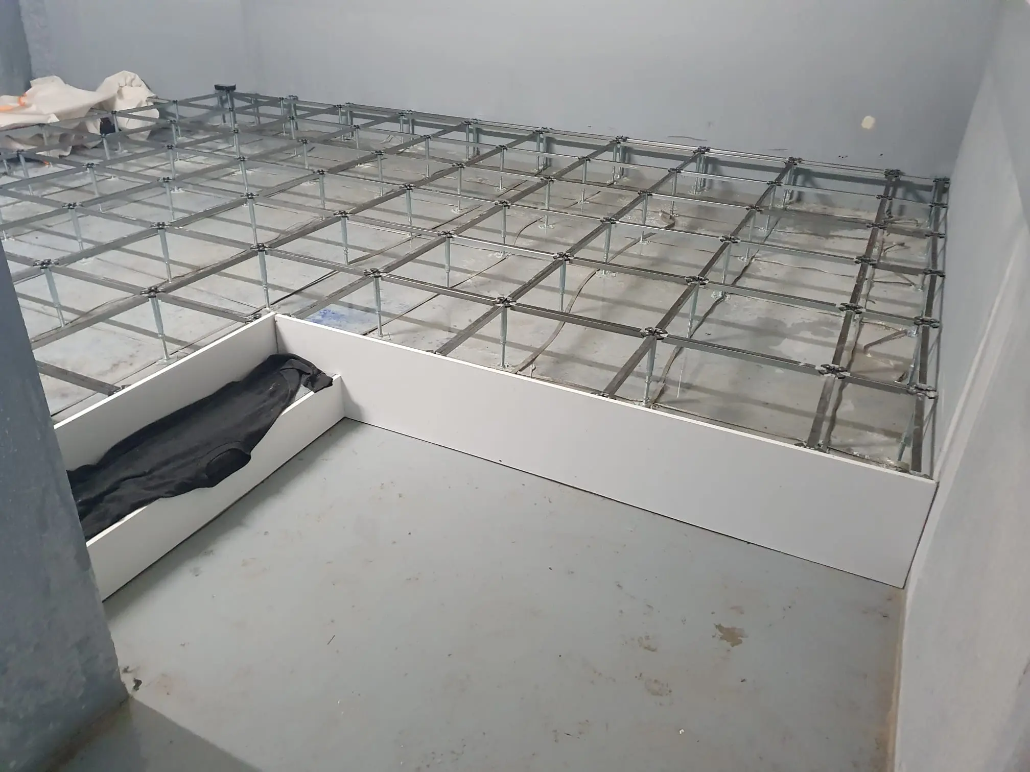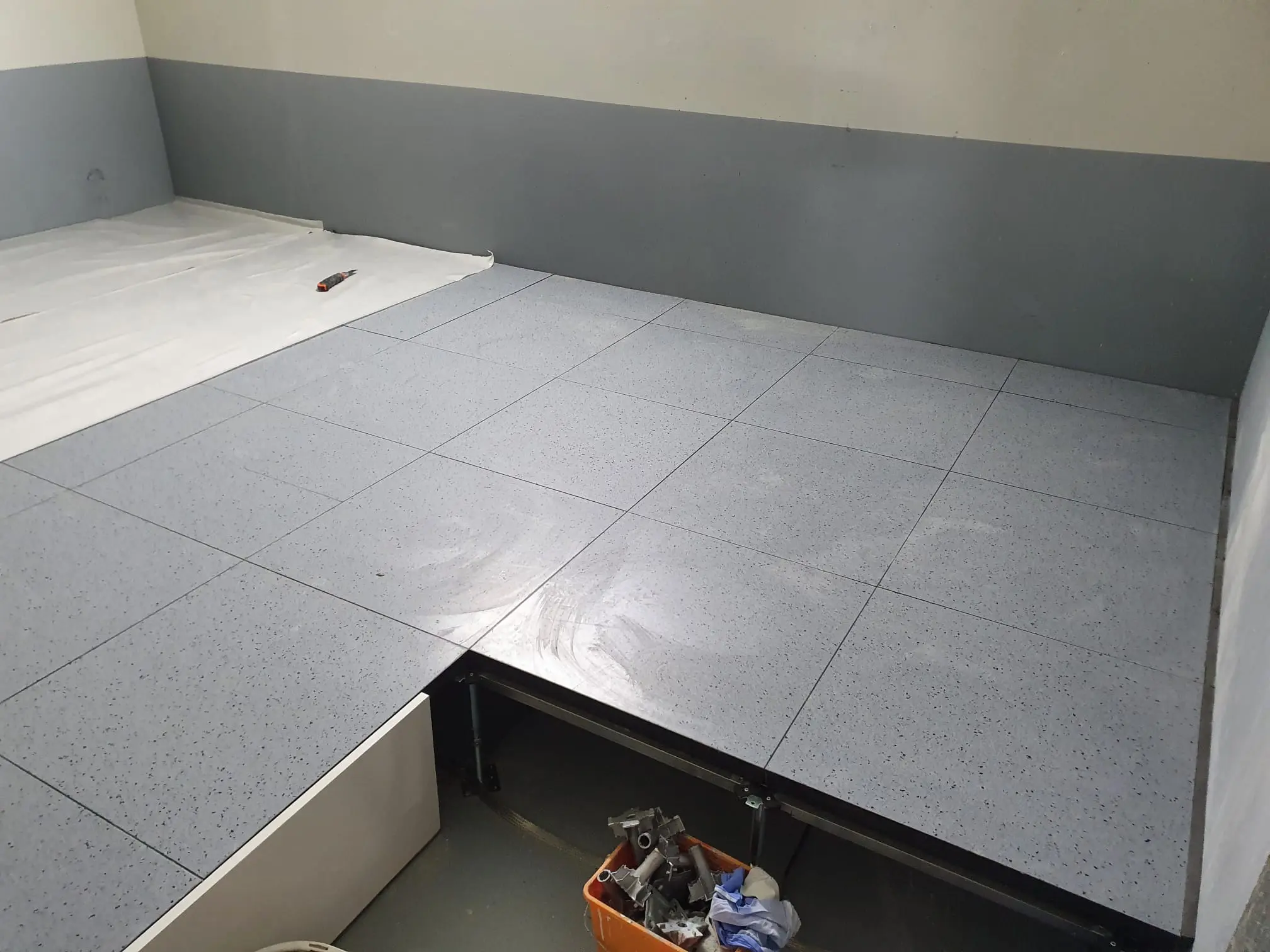 Chantier de plancher technique en dalles stratifiées, posé sur traverses, avec un plénum de 250 à 300 mm et protection en polyane.