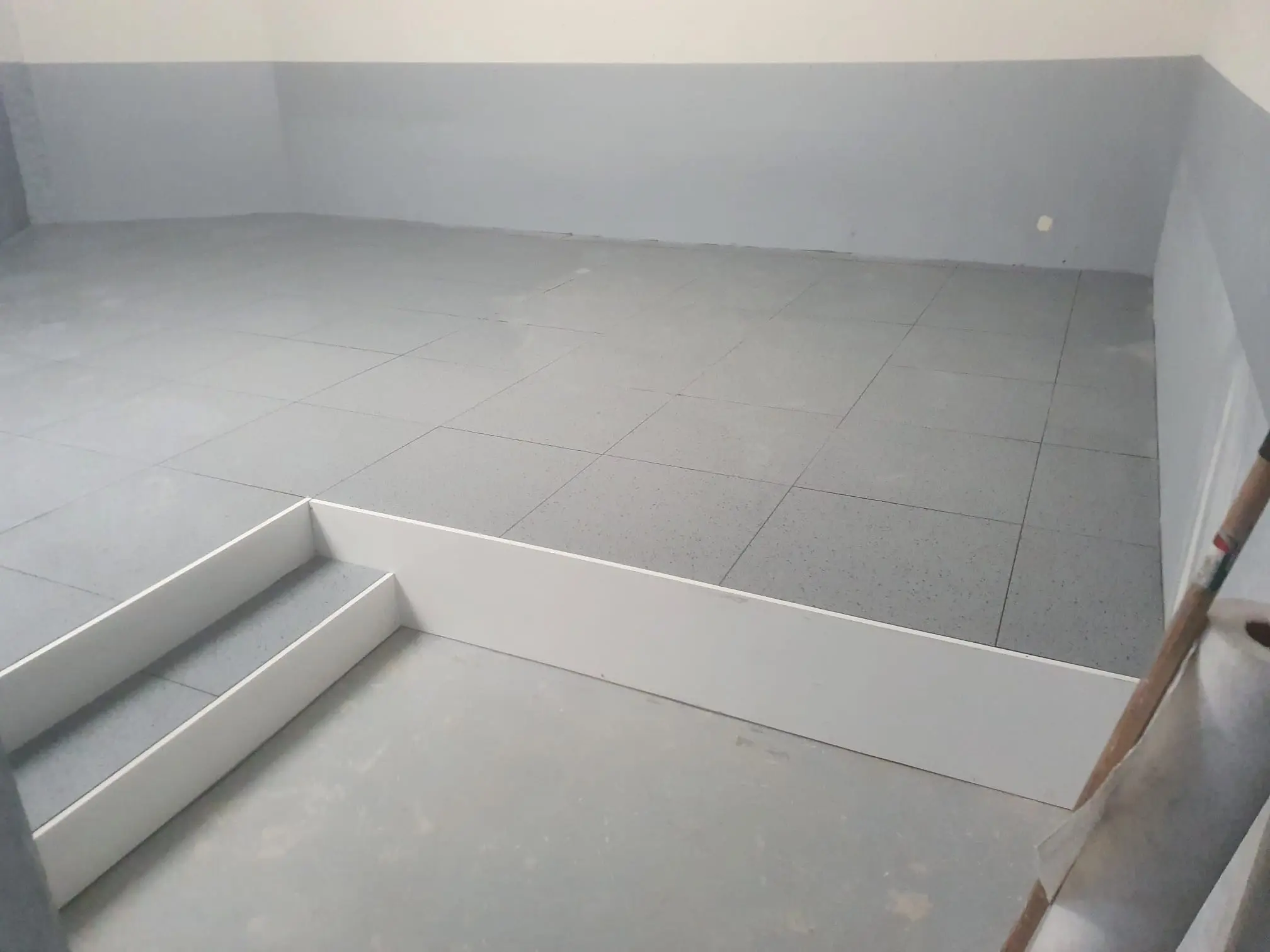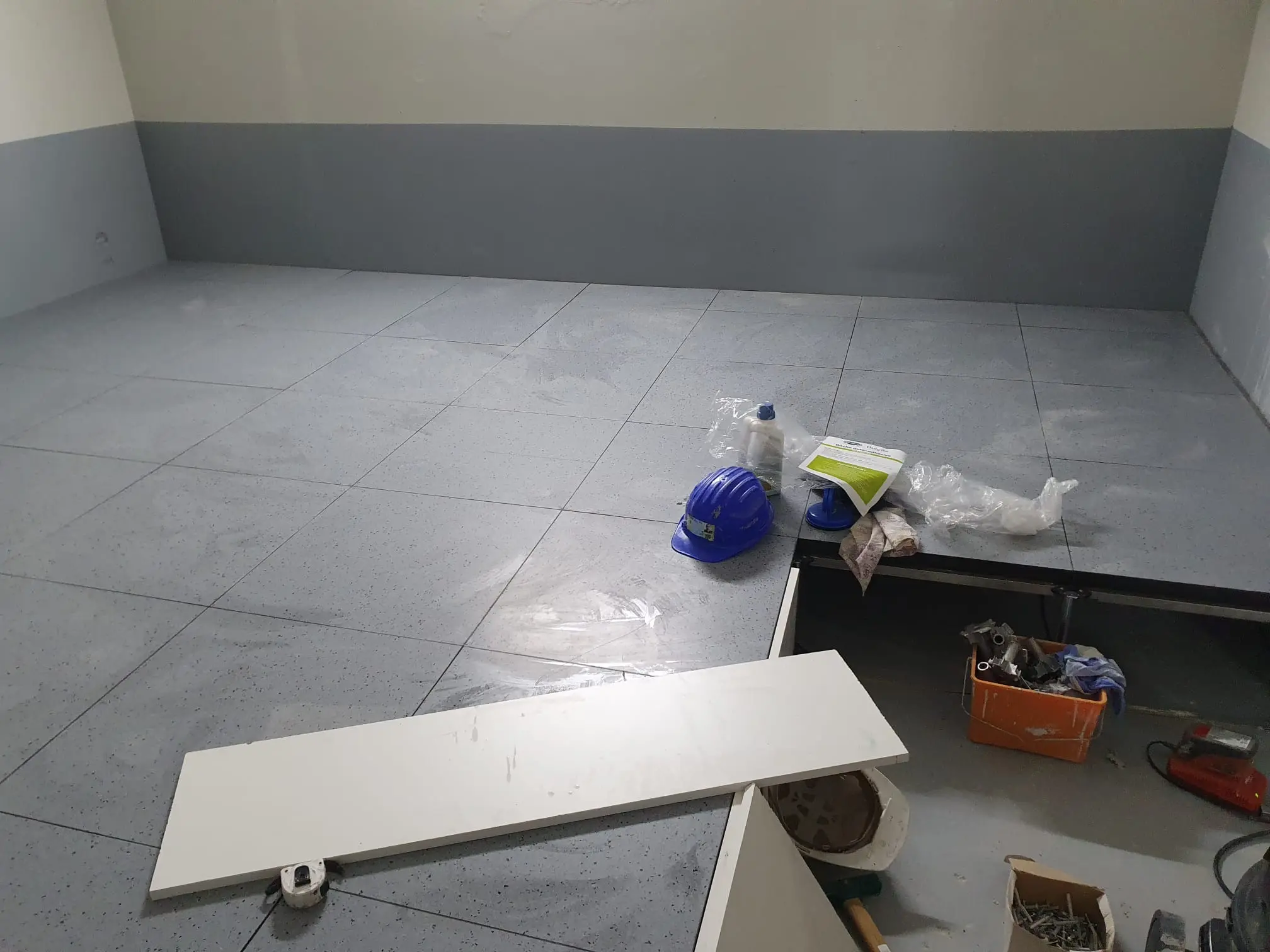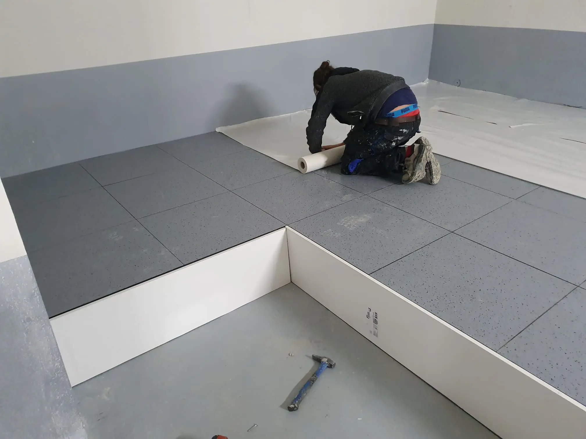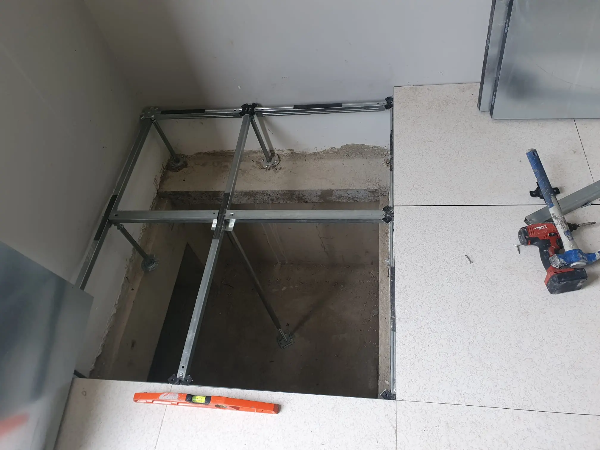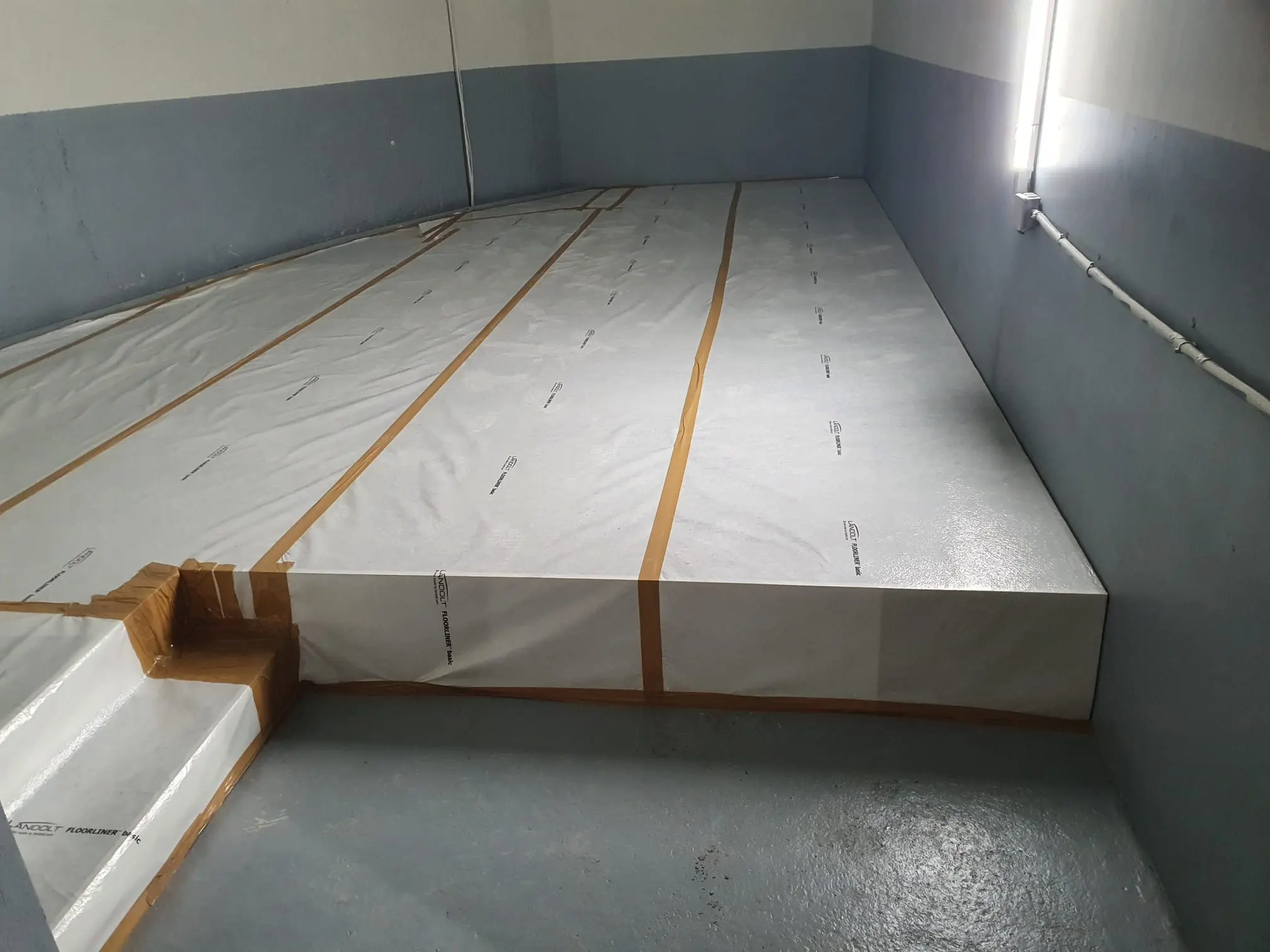Chantier de plancher technique en dalles stratifiées, posé sur traverses, avec un plénum de 250 à 300 mm et protection en polyane.